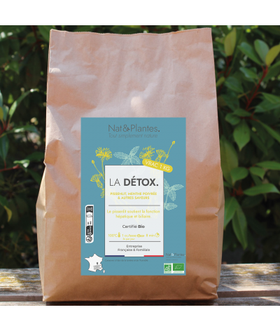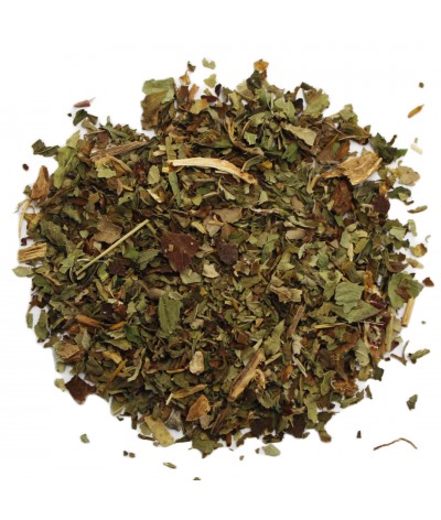 Composition : Pissenlit feuille BIO (30%), Ronce feuille BIO (30%), Bardane racine BIO (20%), Menthe poivrée feuille BIO (20%)
