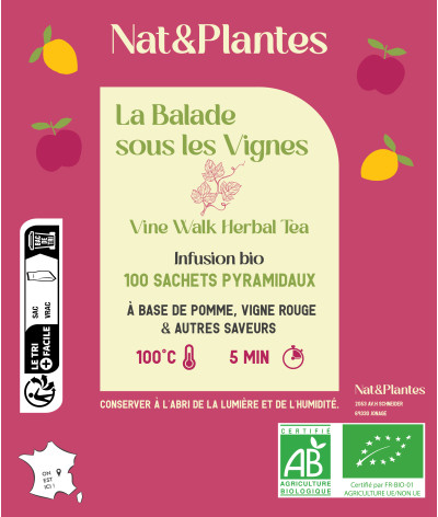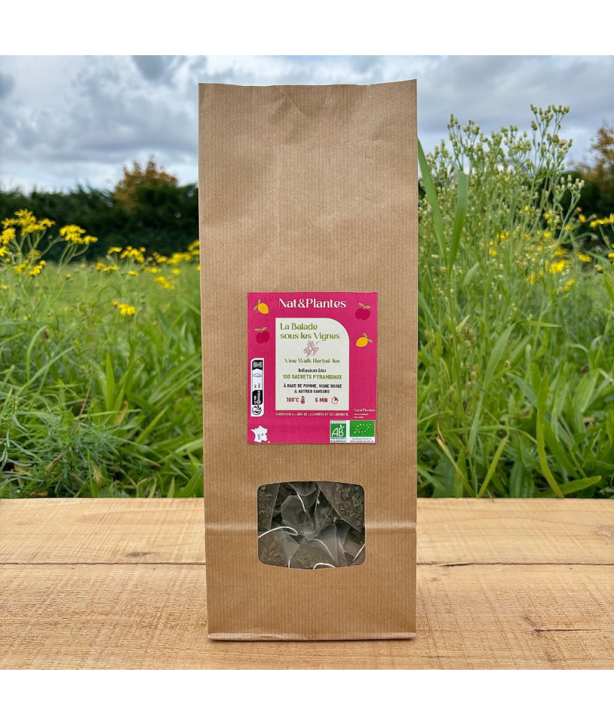 Notre infusion bio la Balade sous les Vignes est proposée dans un emballage en Kraft fabriqué en France, recyclable. Dans une démarche circulaire, ses sacs permettent de recharger vos contenants sans racheter de nouvelle boîte. Cela convient parfaitement aux amateurs de vrac.